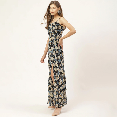 Black and off-white floral print knitted high-slit tiered maxi dress, has shoulder straps, an attached lining, and flared hem