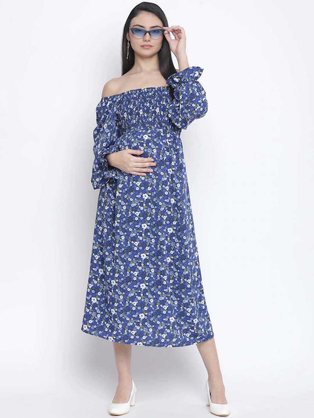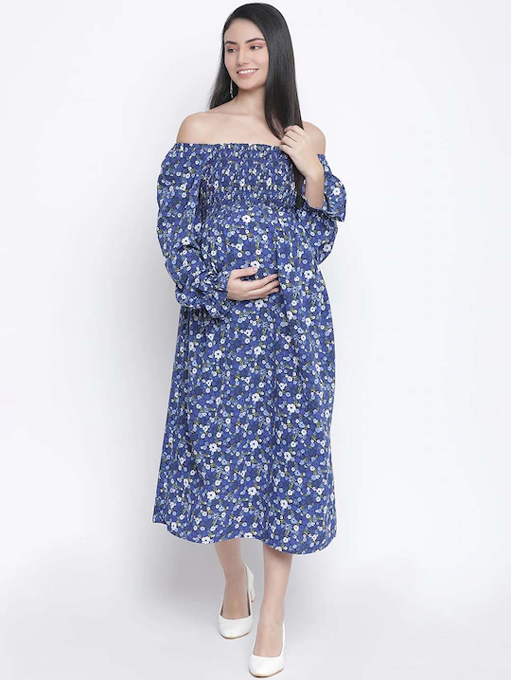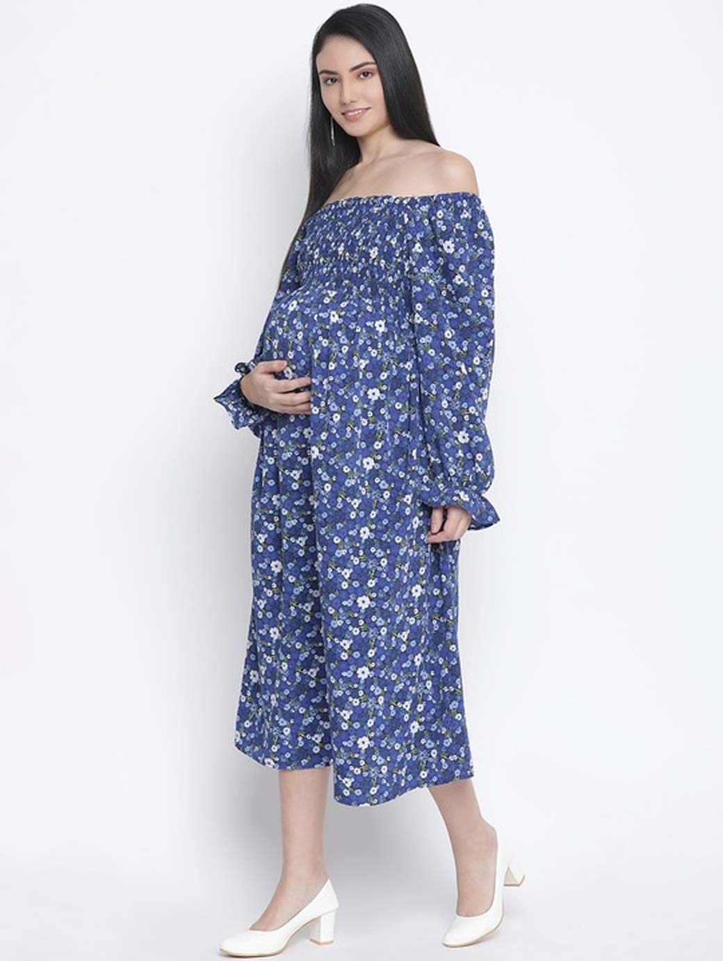 Blue & White Floral Off-Shoulder Satin Maternity Midi Dress