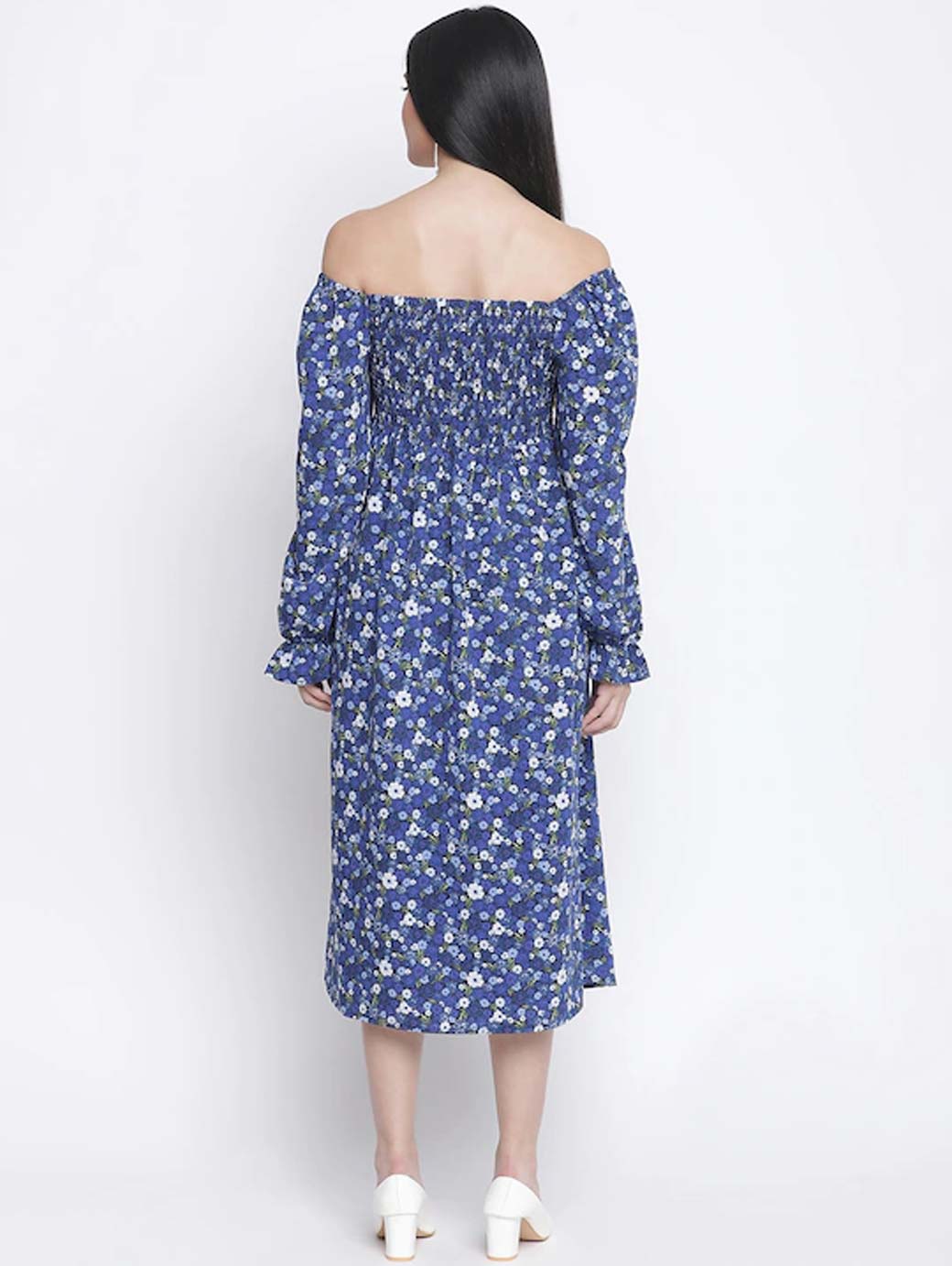Blue and white floral print fit & flare dress Off-shoulder Long, regular sleeves Midi length in flared hem Satin fabric