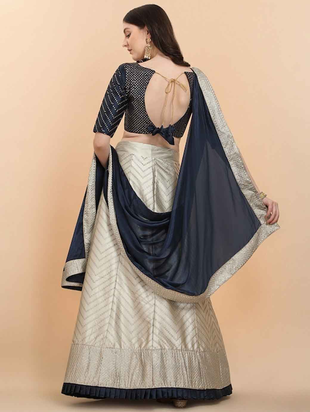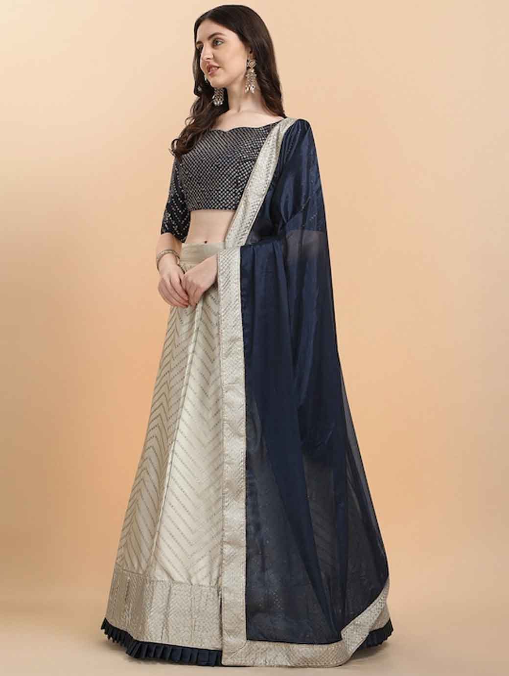 Cream-Coloured & Navy Blue Embellished Sequinned Semi-Stitched Lehenga & Unstitched Blouse