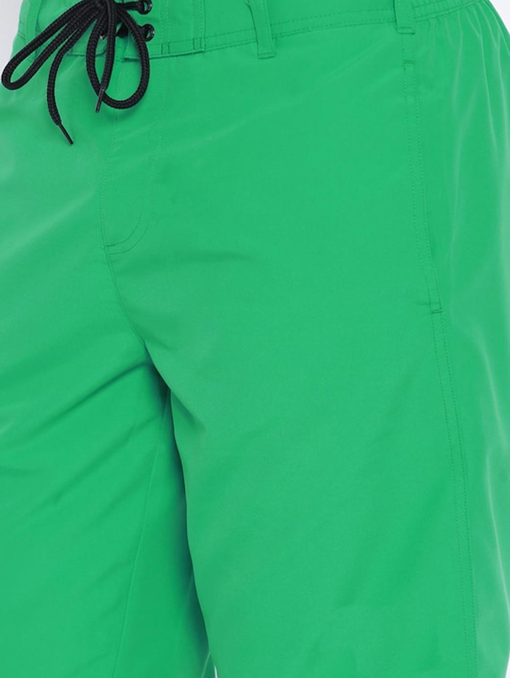 A pair of green woven mid-rise swim shorts, has three pockets, a waistband with belt loops and drawstring fastening, has an attached mesh lining