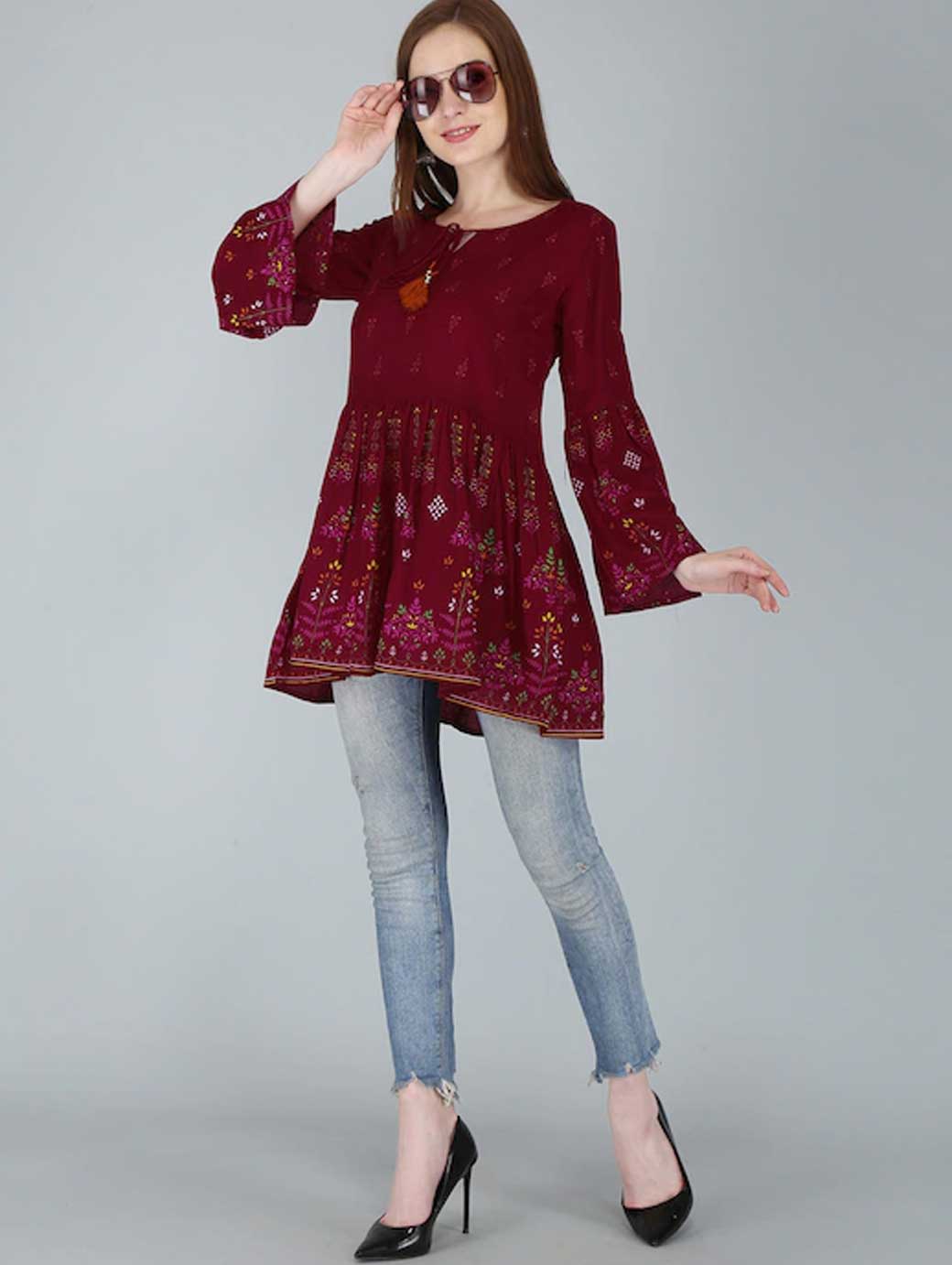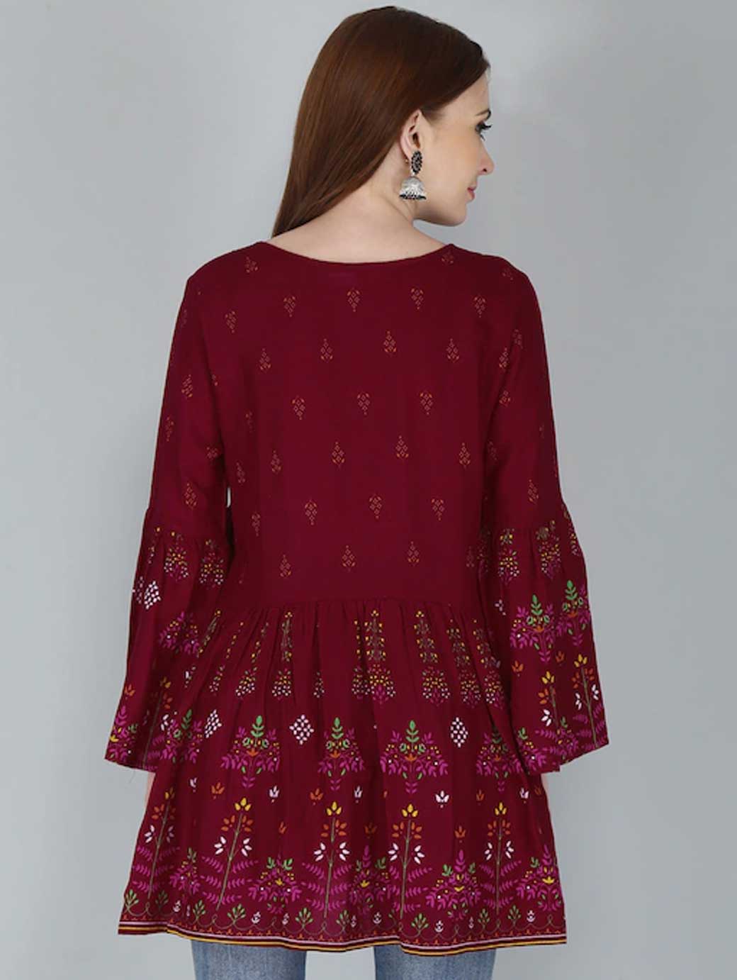 Red regular peplum top Floral print Round neck, three-quarter, bell sleeve sleeves Tie-ups detail Knitted cotton.