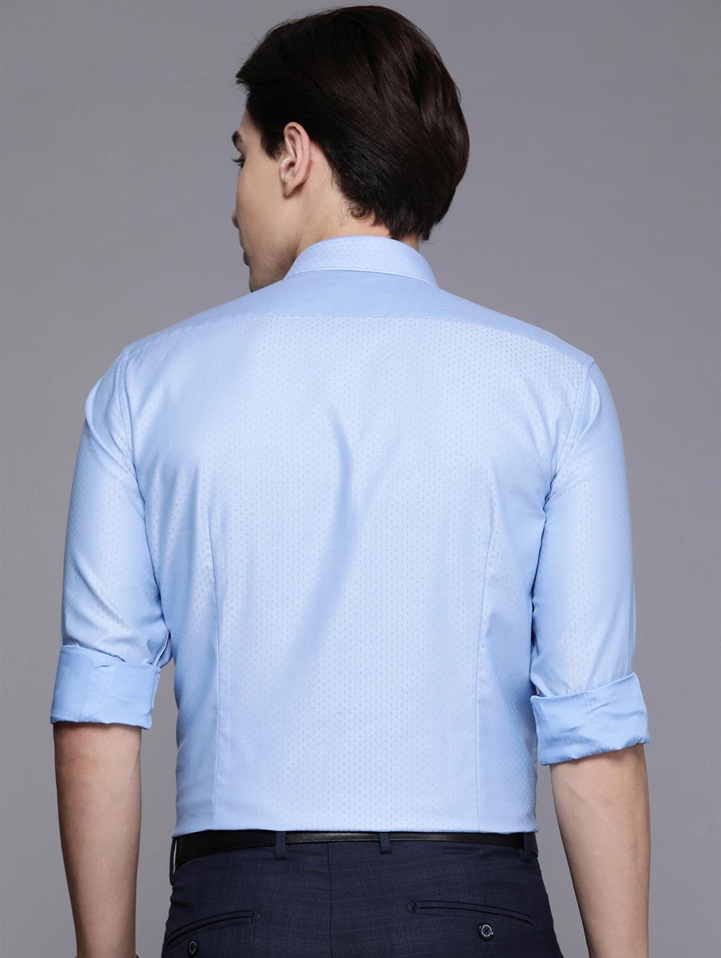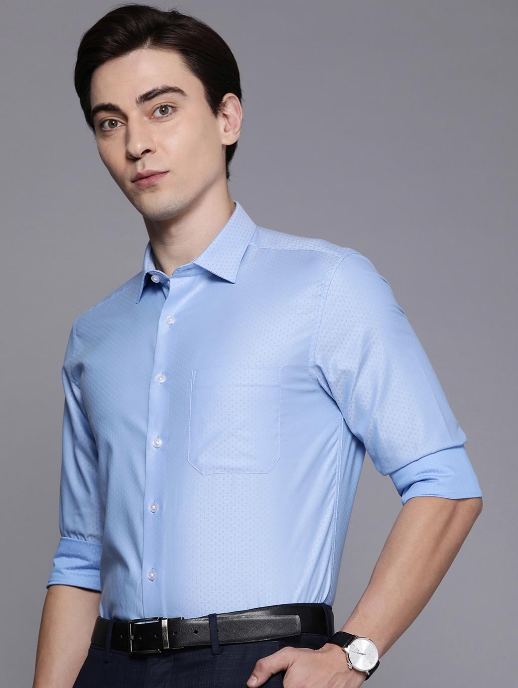 Blue micro ditsy printed Formal shirt ,has a spread collar, button placket, 1 patch pocket, long regular sleeves, curved hem