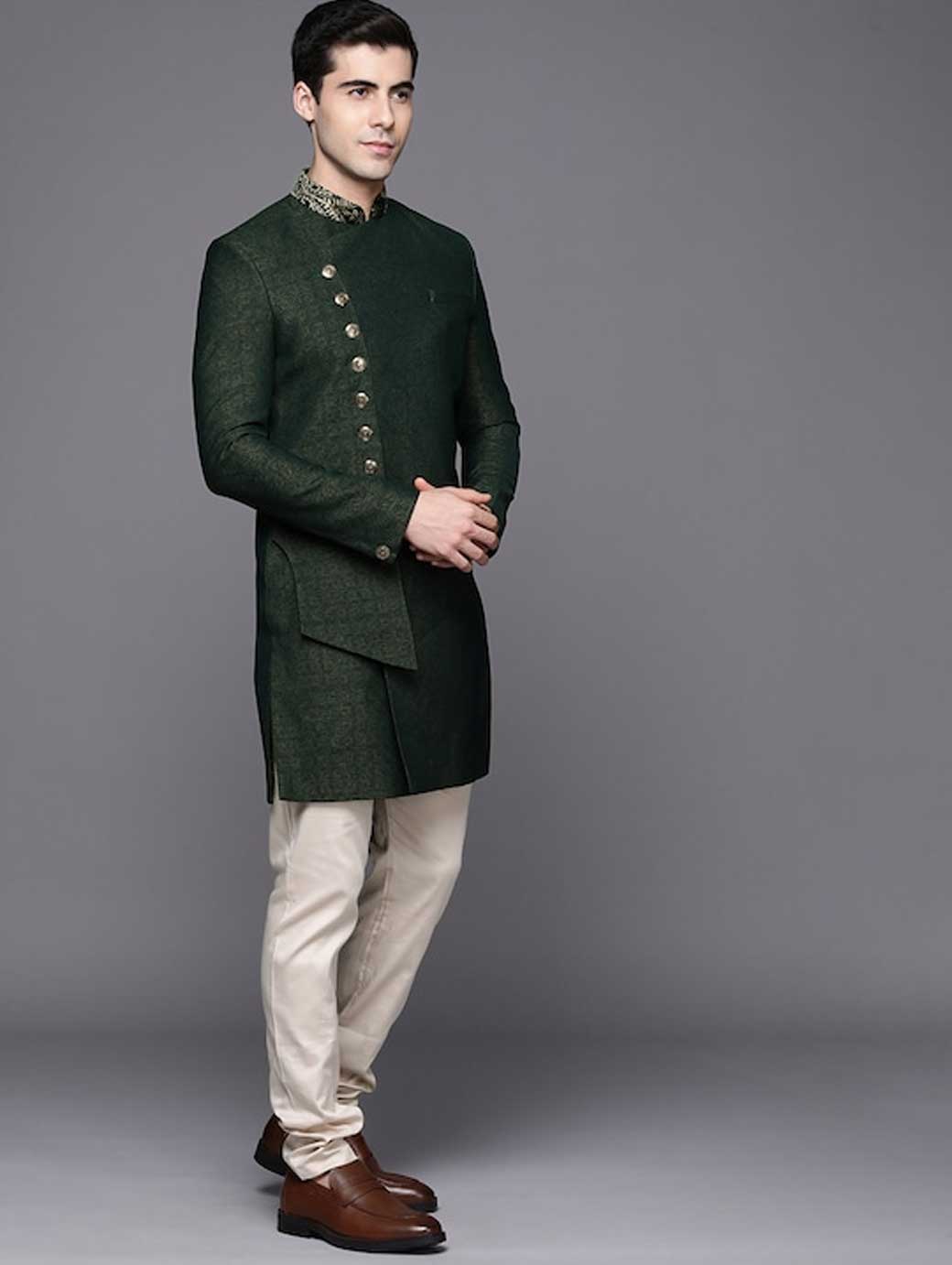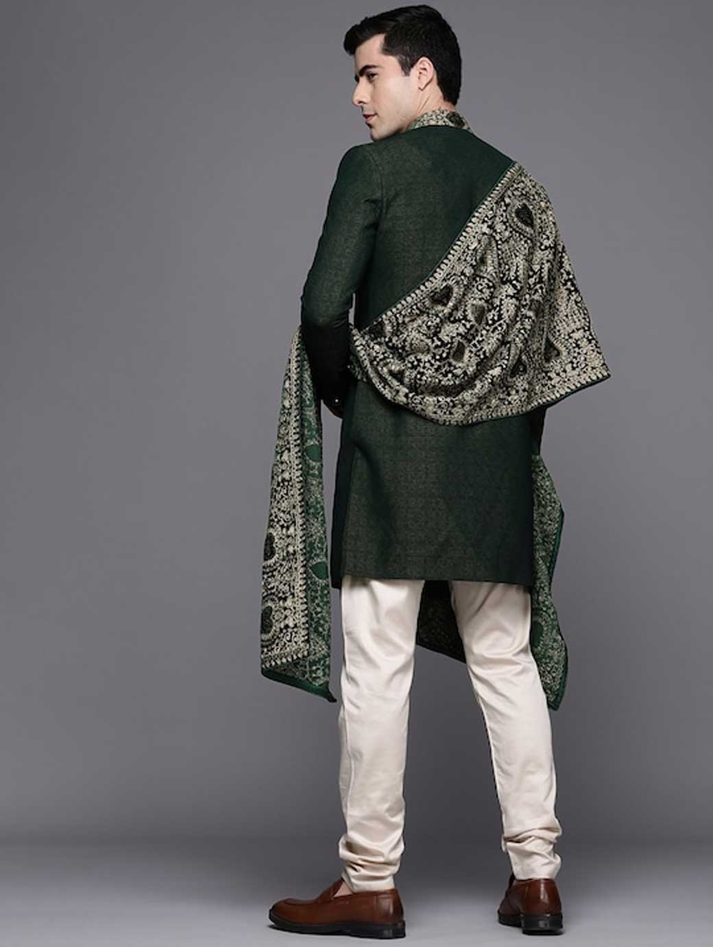 Men Green & Off White Self Design Sherwani Set With Dupatta