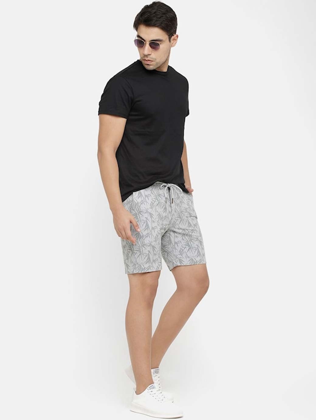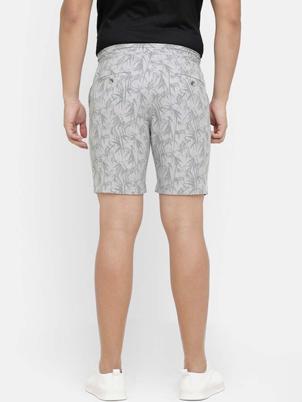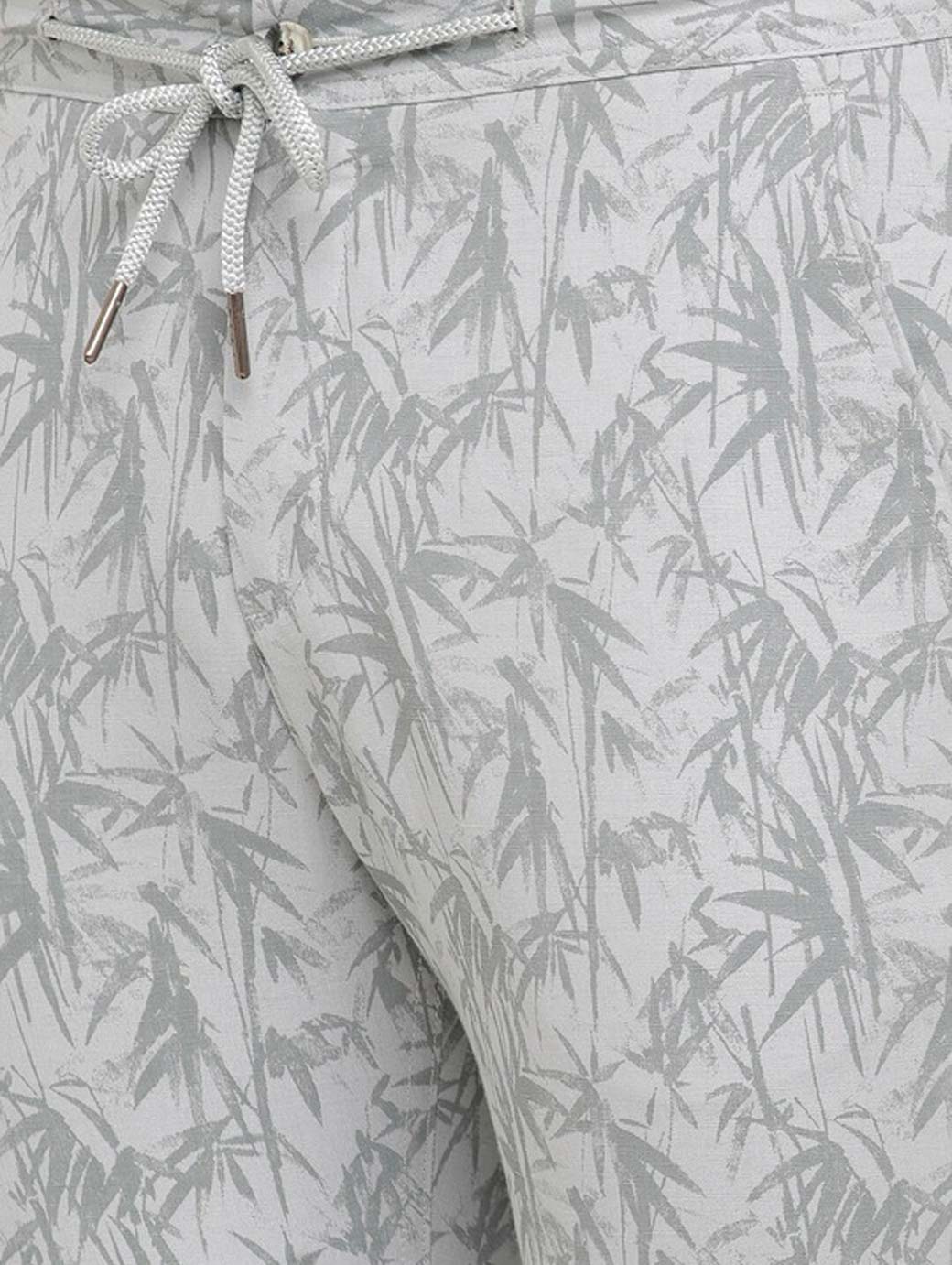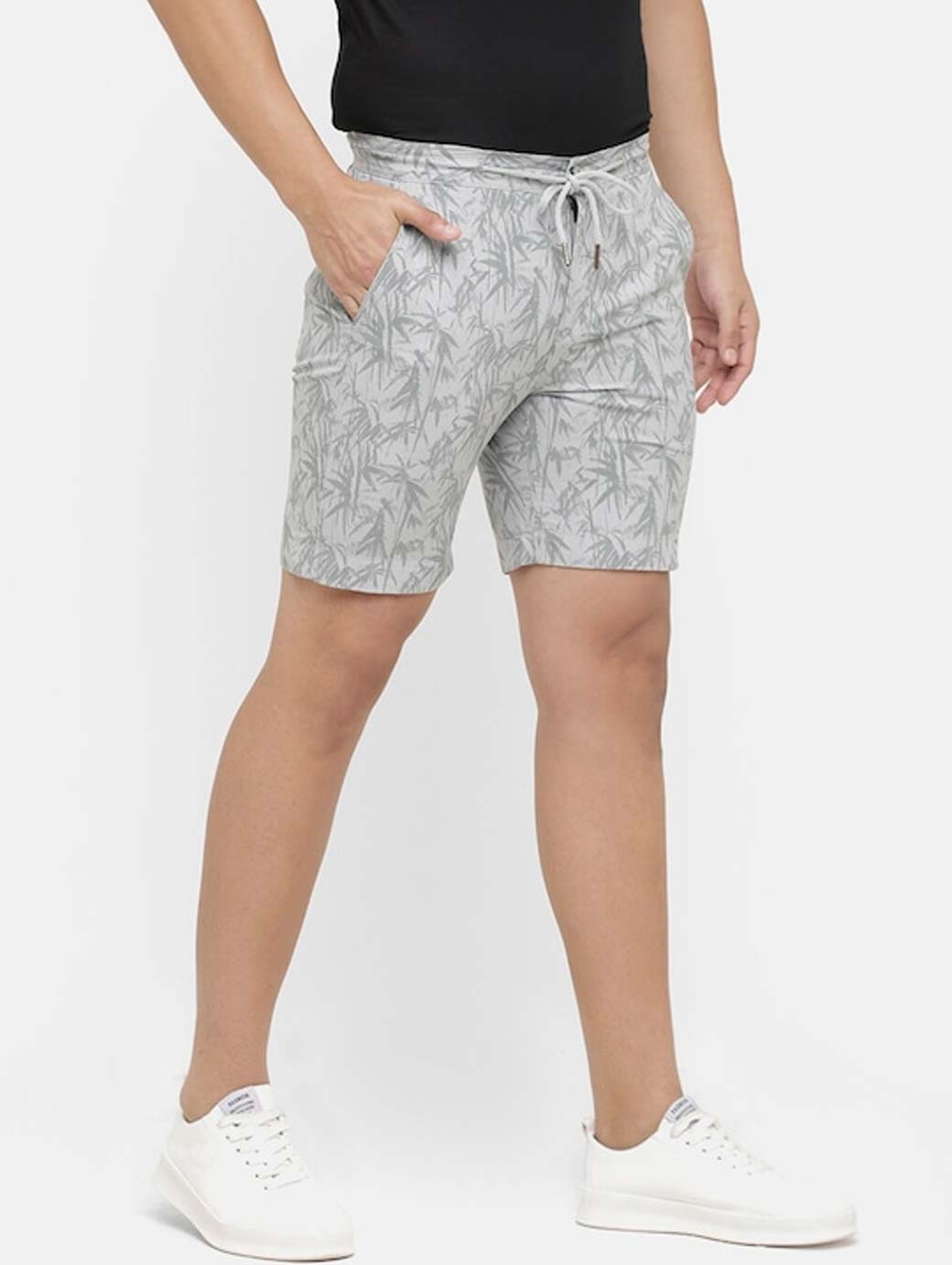 Grey printed mid-rise regular shorts, has 4 pockets, and drawstring closure