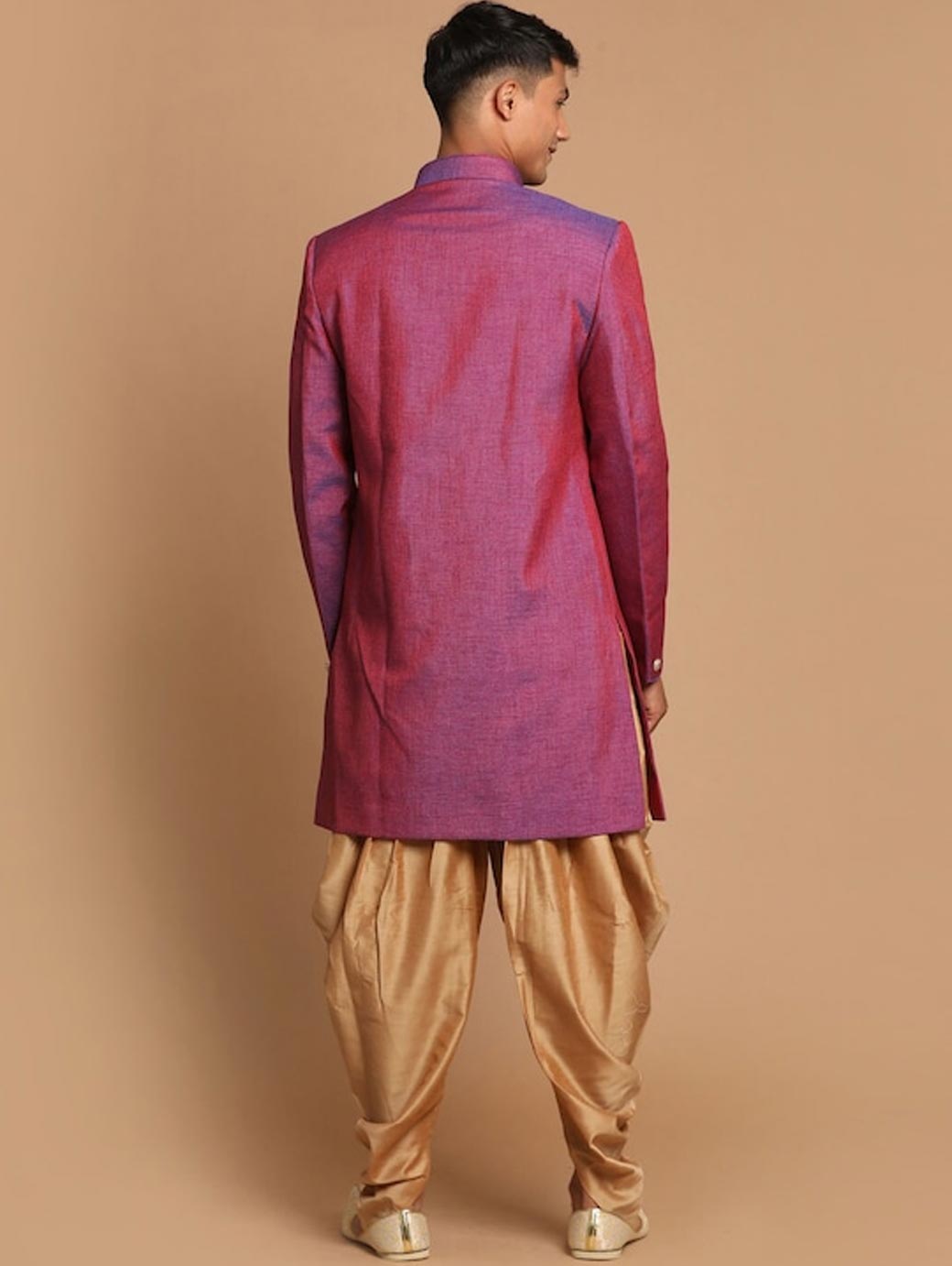 Purple woven-design sherwani set, has a mandarin collar, full-front button placket, long sleeves, a straight hem, and multiple slits Rose Gold-coloured solid pyjama, has an elasticated waistband with drawstring closure