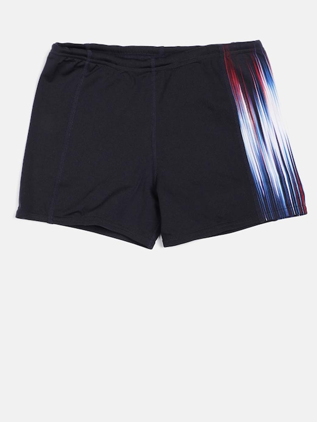 A pair of blue knitted mid-rise swim shorts with printed detail, has an elasticated waistband with a drawstring fastening, 100% chlorine resistant.