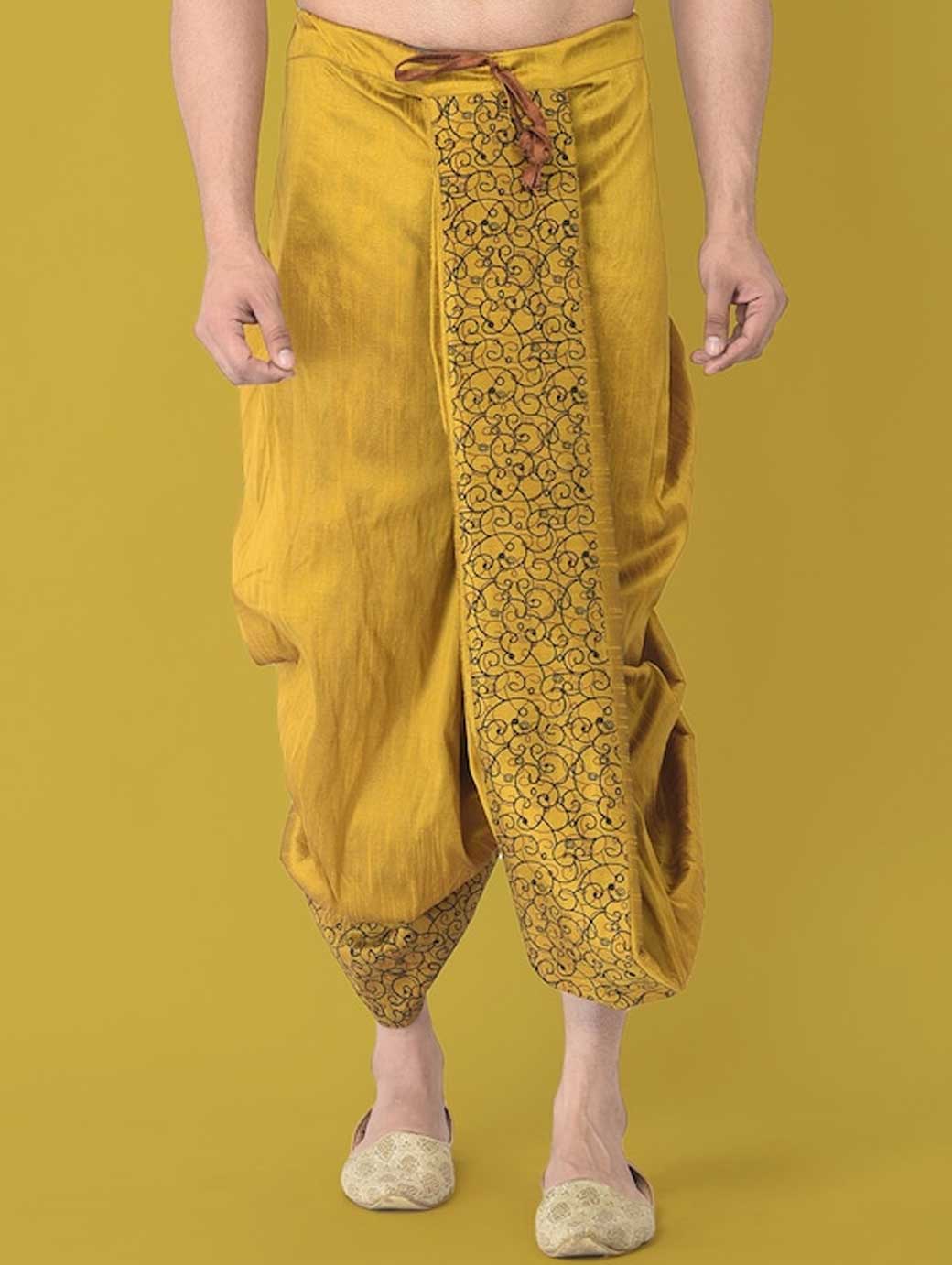 Men Yellow & Black Printed Dupion Silk Dhoti Pants