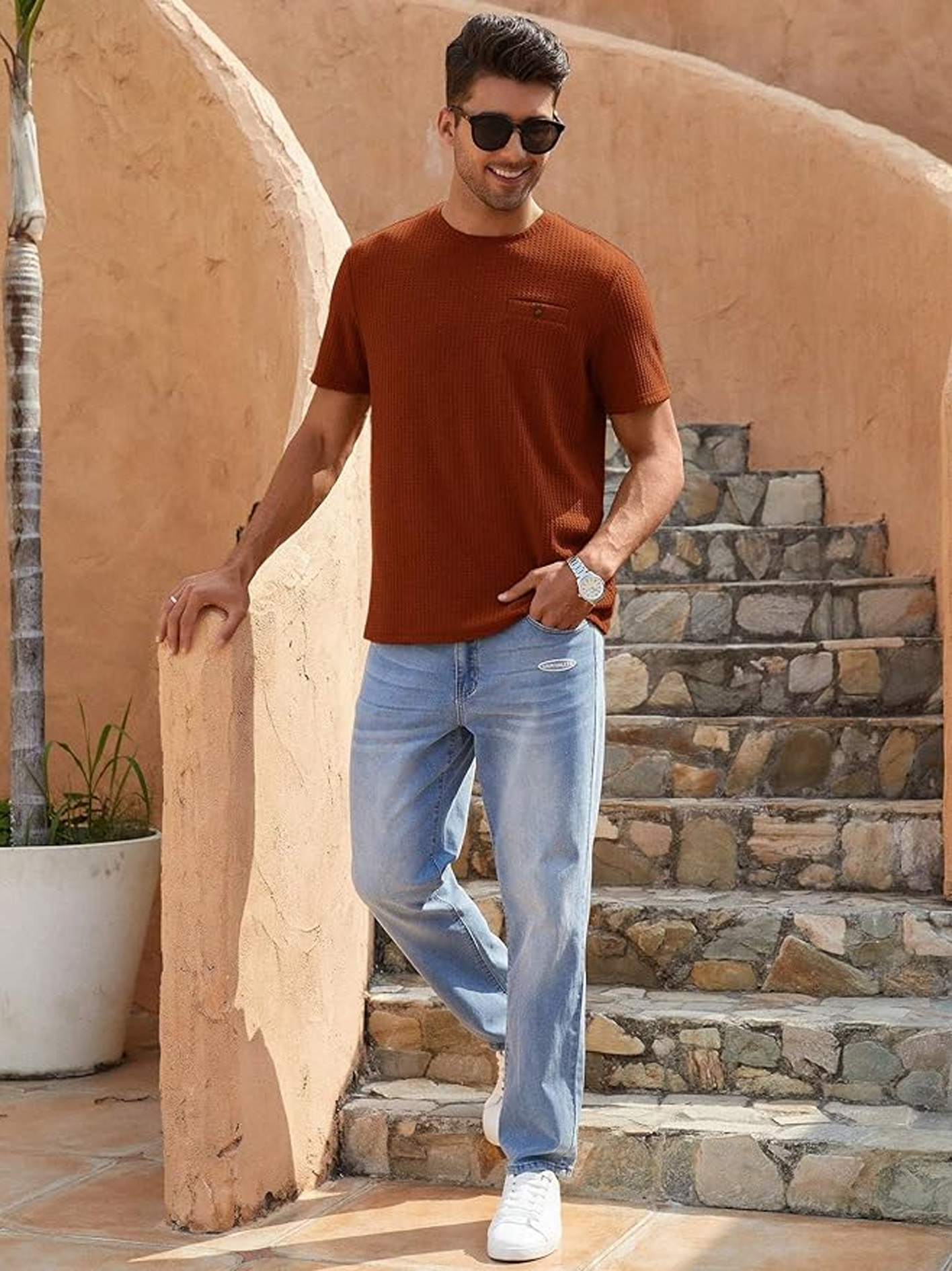 Features : Waffle Knit, Crew Neck, Short Sleeve, Causal Tee