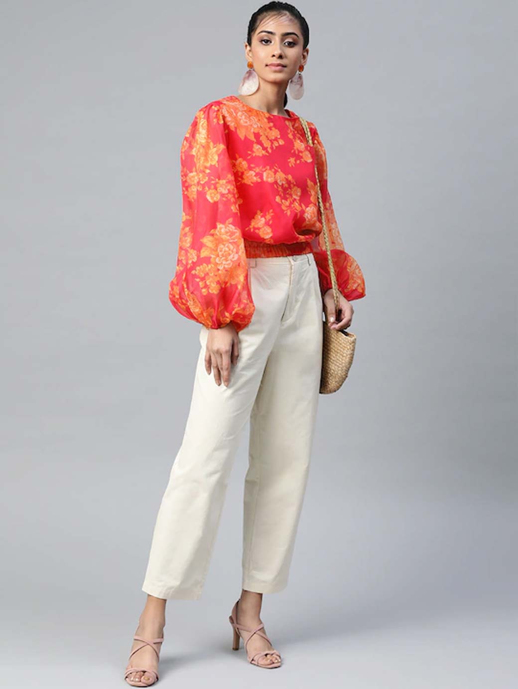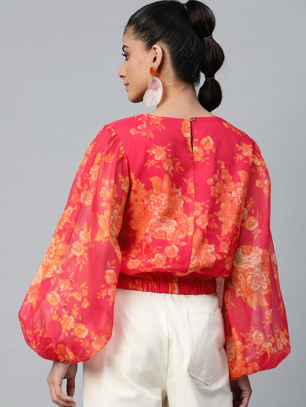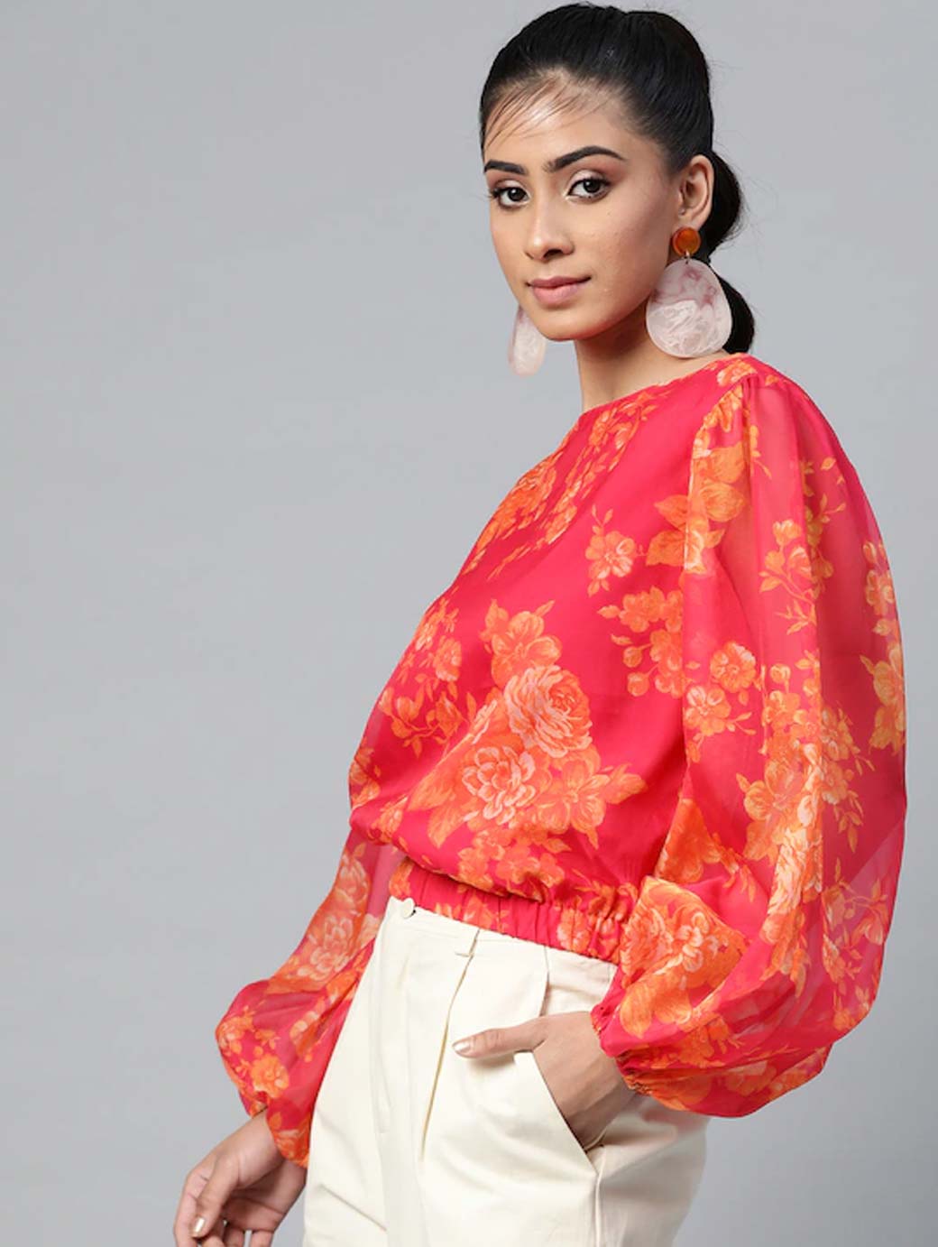 Pink & Orange Floral Printed Puff Sleeves Blouson Top