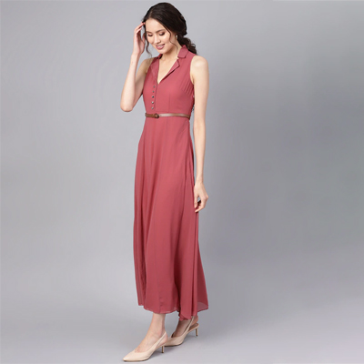 Rose solid woven maxi dress, has a notched lapel collar, sleeveless, concealed zip closure, an attached lining, flared hem Comes with a belt