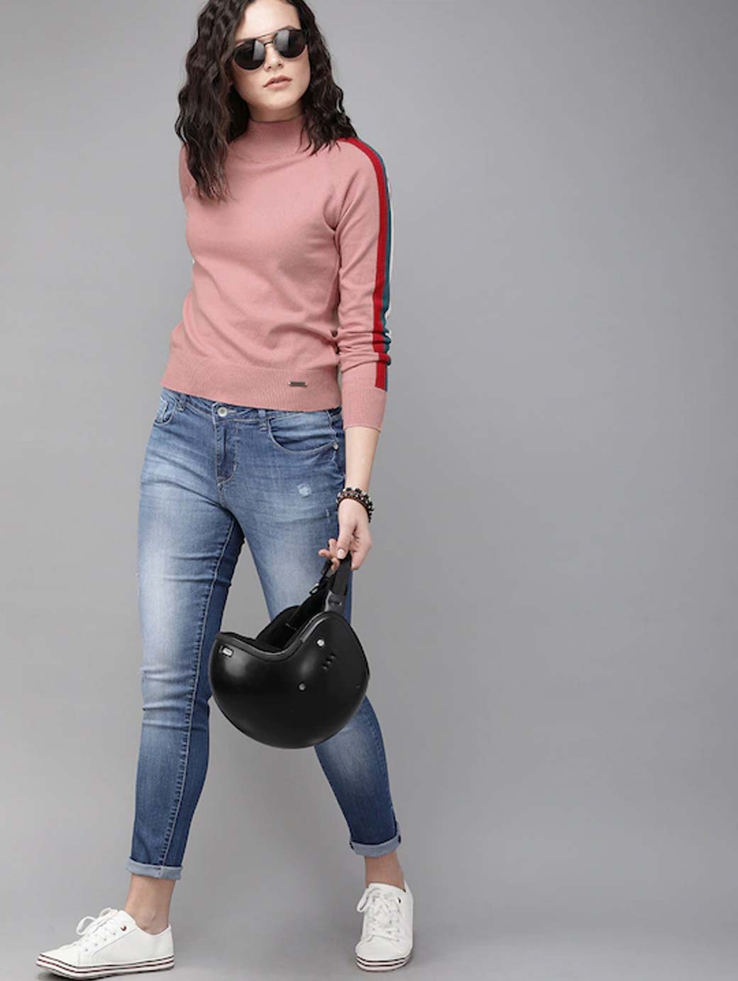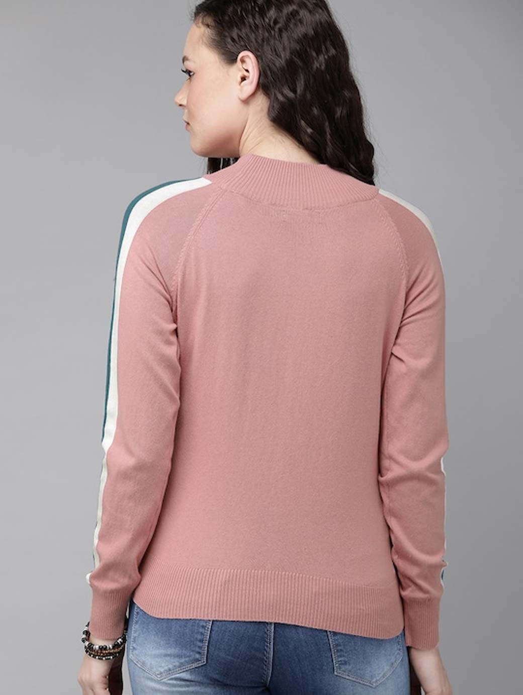 Pink solid knitted regular top, has a round neck, and long sleeves with striped detail