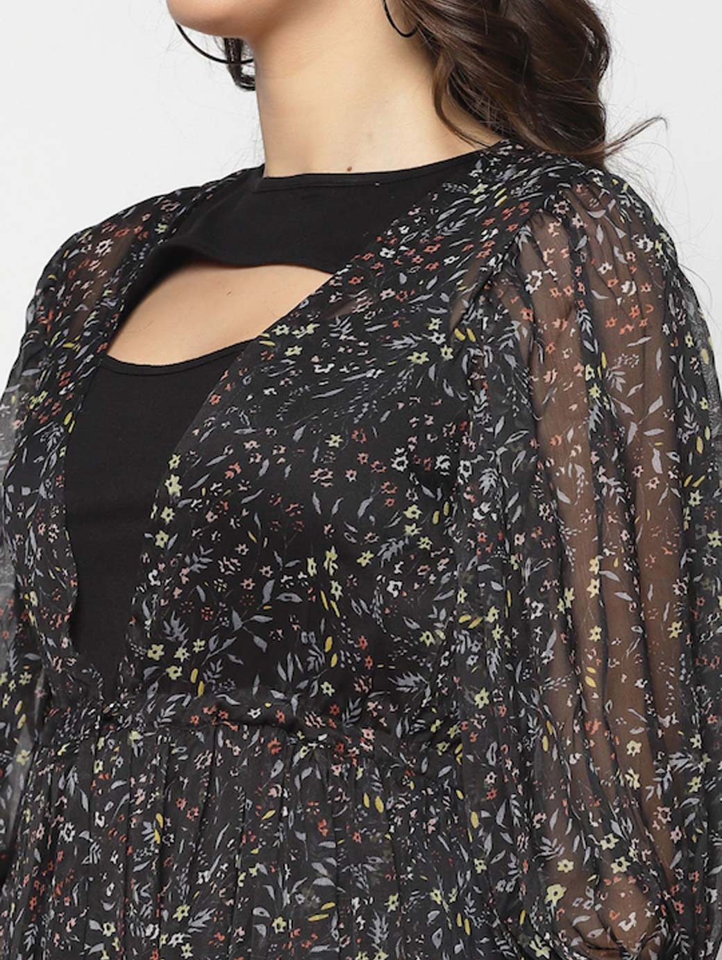Black and grey printed button longline shrug, has long sleeves, gathers detail, straight hem