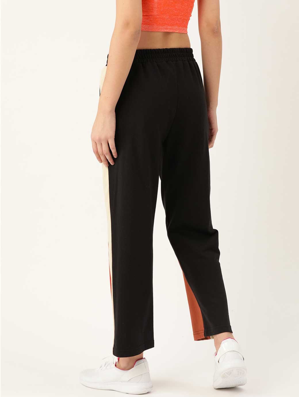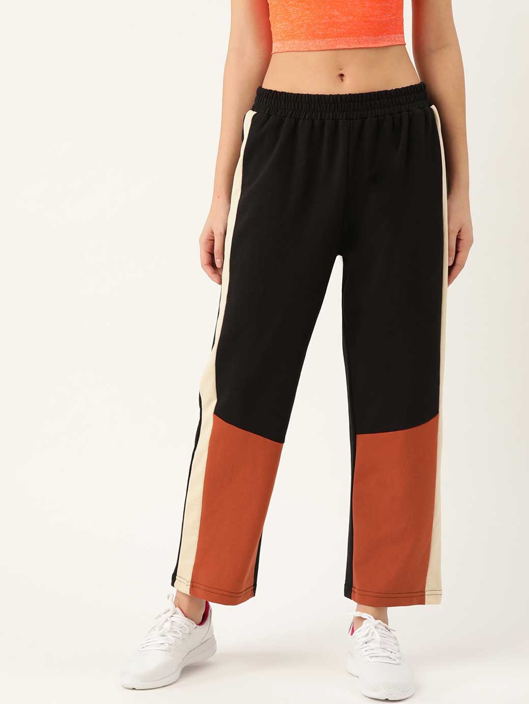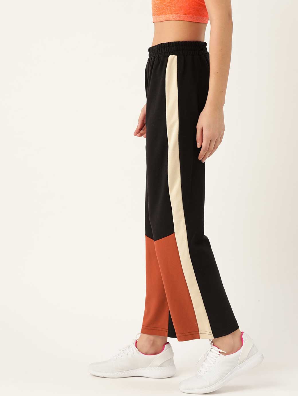 Black and rust orange colourblocked track pants, has an elasticated waistband with slip-on closure, two pockets