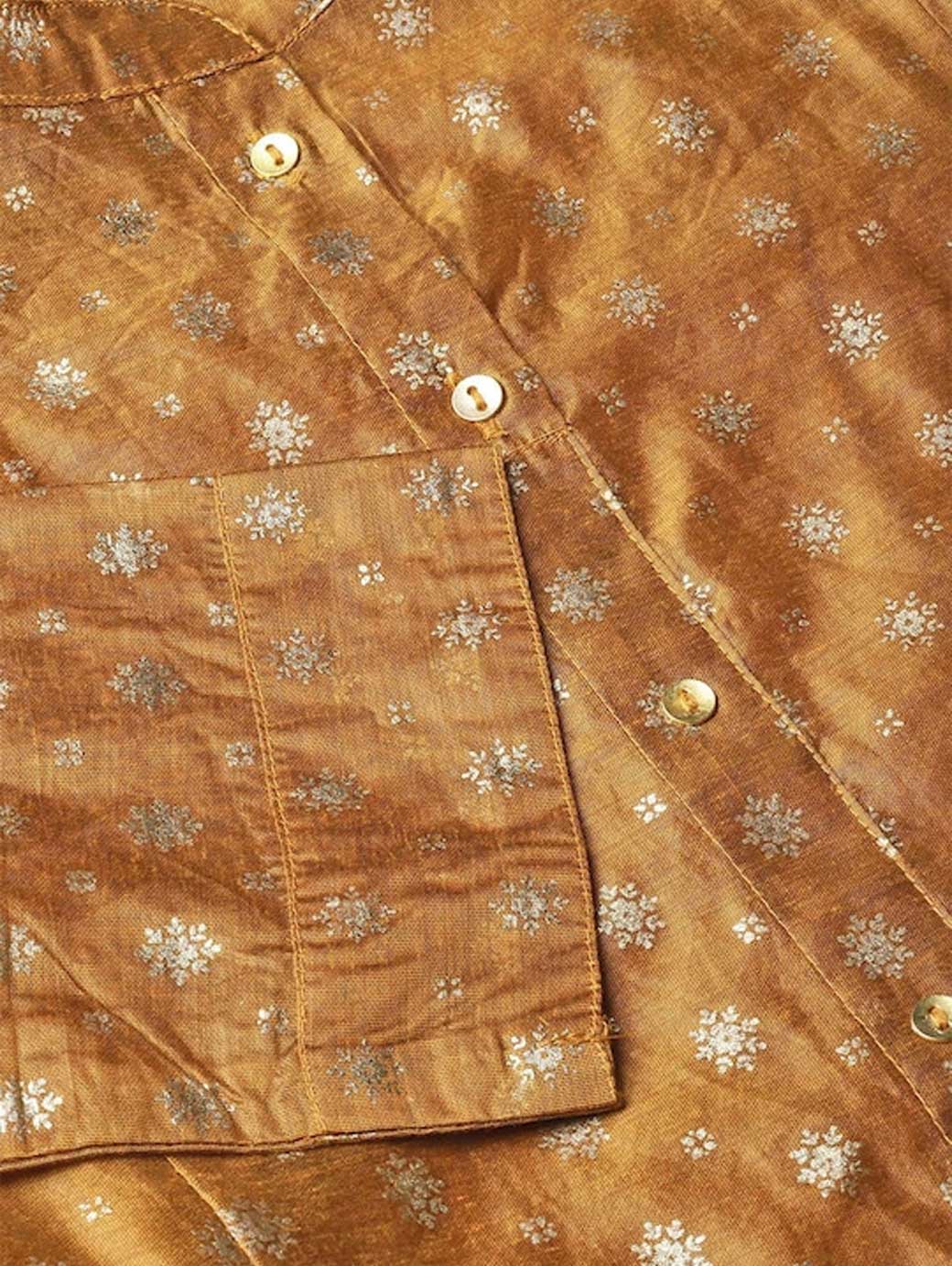 Mustard brown solid A-Line kurta, has a round neck, sleeveless, flared hem Comes with a mustard brown and golden printed anarkali kurta with panelled detail, has a mandarin collar, three-quarter sleeves, and flared hem