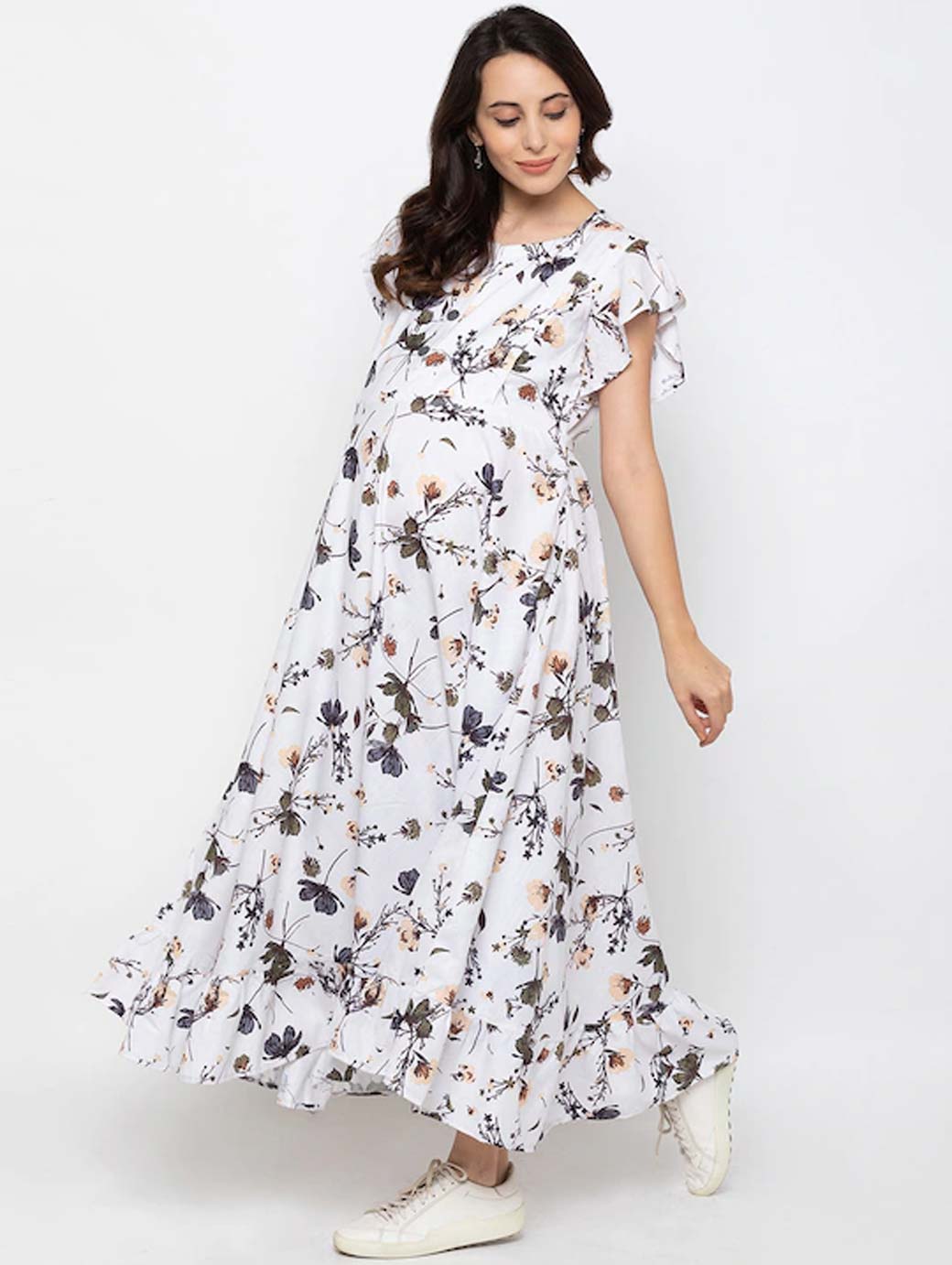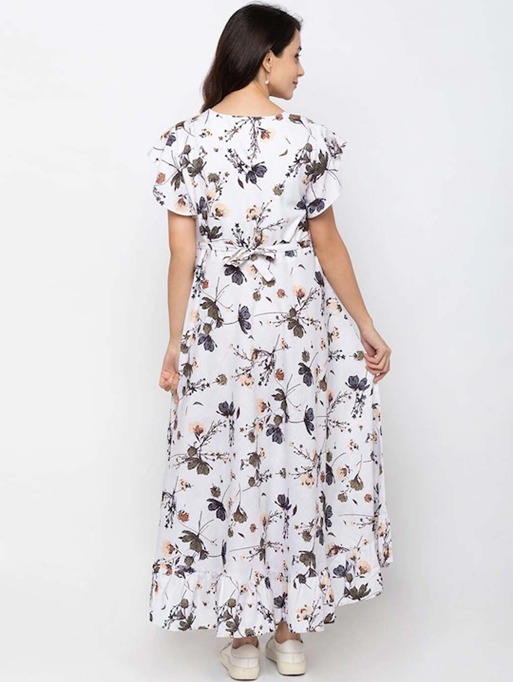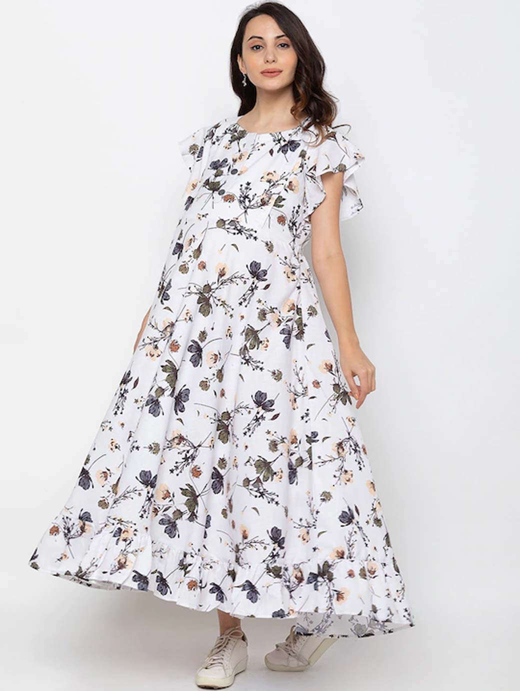 White and Green printed woven maxi dress, has a round neck, short sleeves, concealed zip closure, and flared hem