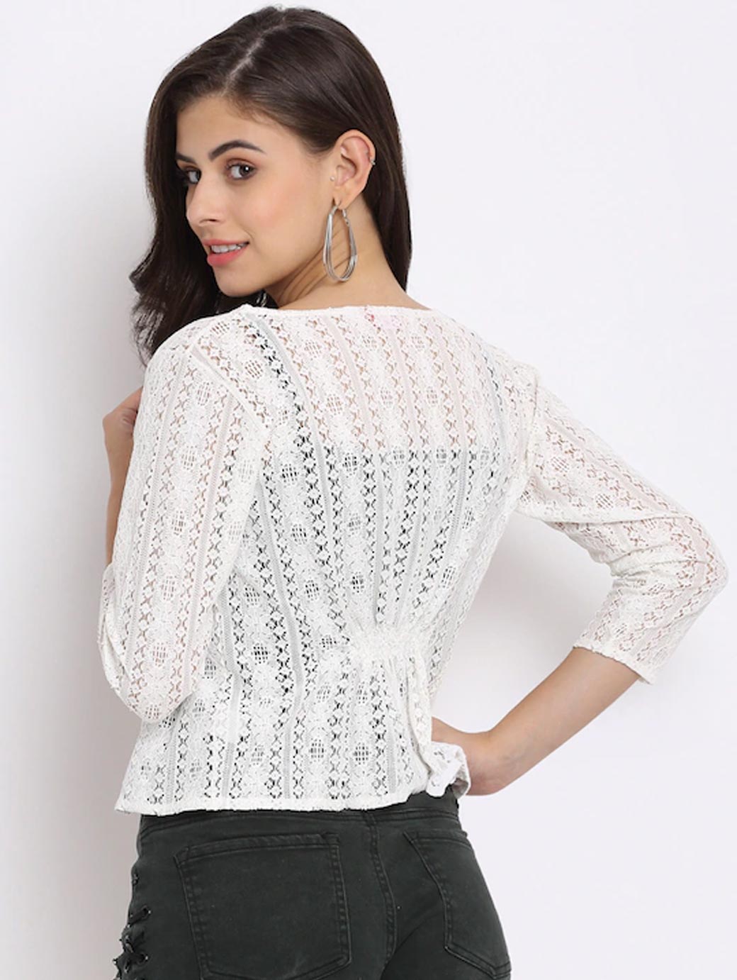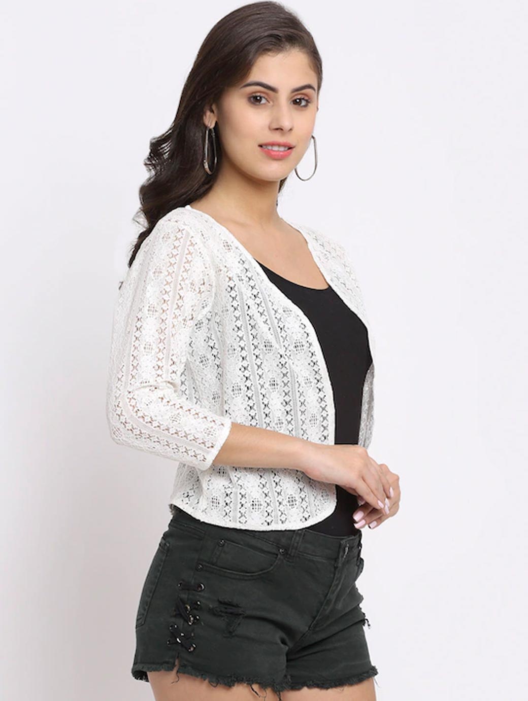 White self design open front regular shrug ,has short sleeves, straight hem