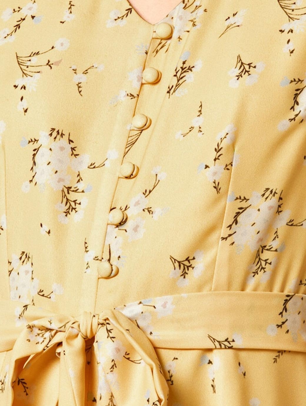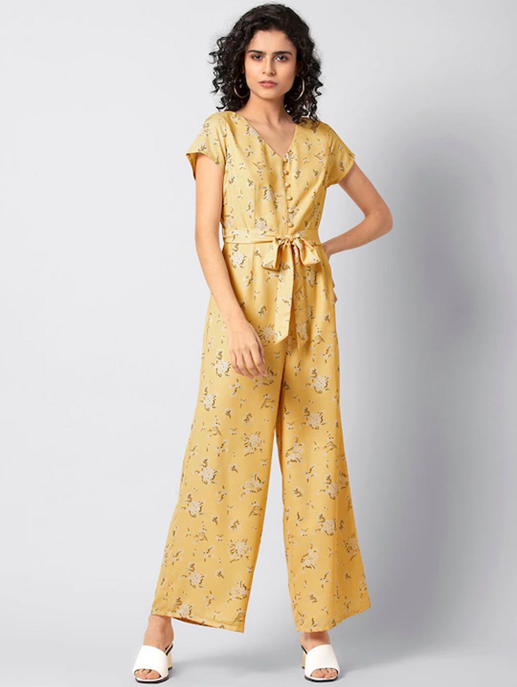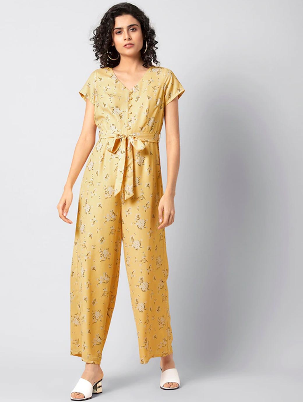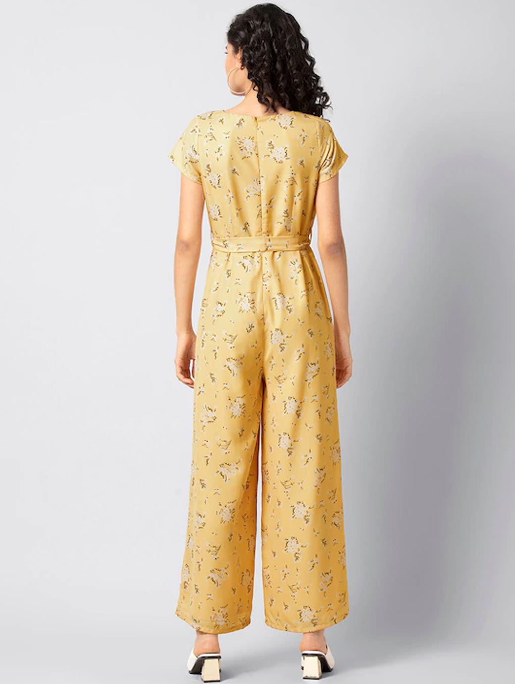 Yellow printed basic jumpsuit, has a V-neck, short sleeves